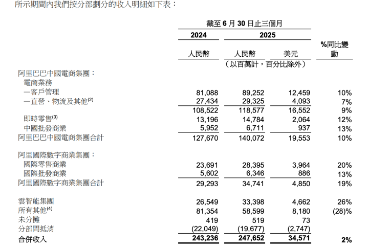 8月29日,阿里巴巴集团(BABA.NYSE/09988.HK)发布2026财年第一季度财报(截至2025年6月30日的第二季度)财报,财报显示,第二季度,阿里巴巴营收2476.5亿元,同比增长2%,若不考虑高鑫零售等已出售业务,同比增长10%。